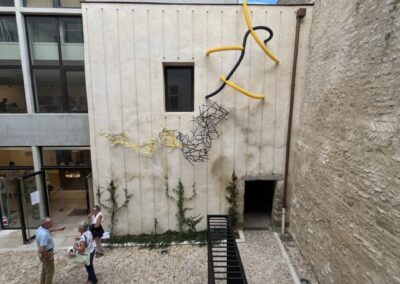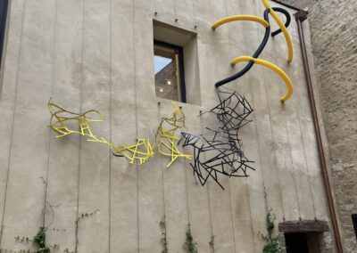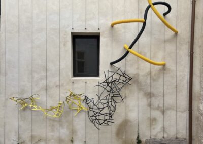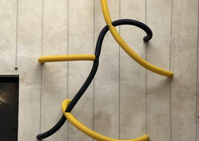 Cette réalisation hybride plusieurs matériaux industriels présents dans mon travail de manière récurrente. Elle détourne leur usage pour leur donner des formes organiques, évoquer le vivant en dialogue avec l’espace environnant.